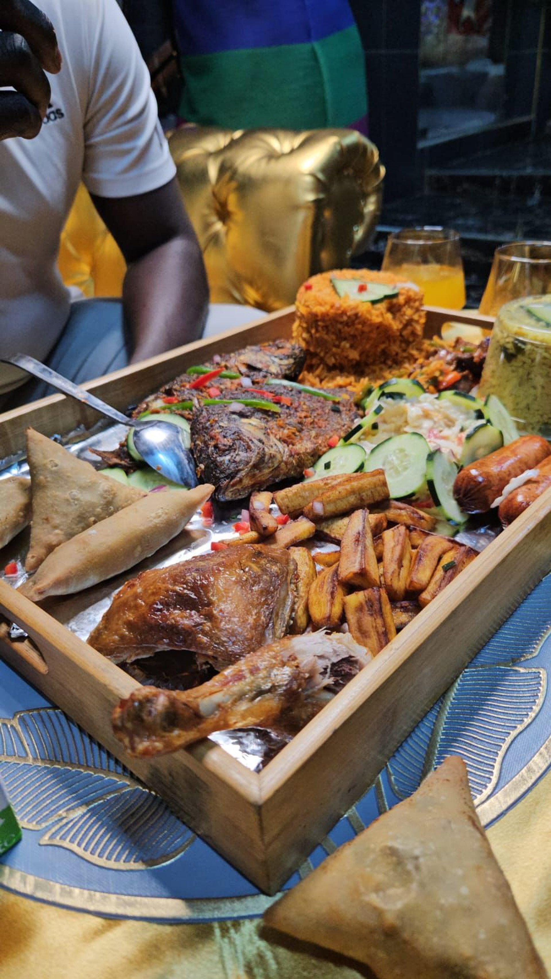 An exquisite meal that combines fried, roasted, or barbecued chicken with French fries (chips)